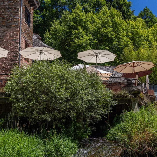 Sous les arbres, face à la rivière, la terrasse du Moulin devient le coeur battant de la maison. C’est là que l’on s’attarde autour d’un verre, que l’on déguste un dîner au Bistrot Héron, en écoutant le Dourdou qui file doucement à vos pieds. À midi comme le soir, la cuisine du bistrot se fait estivale, généreuse et fraîche, pensée pour les déjeuners ensoleillés et les repas partagés à l’ombre des feuillages.